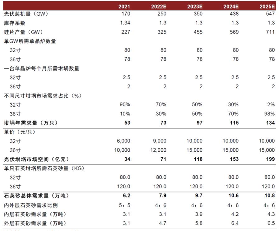 光伏用石英坩埚和石英砂需求测算 资料来源:Wind、36氪整理