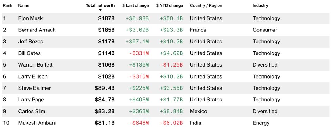 不止马斯克,在富豪排行榜靠前的几位,财富也在急速上涨,除了马斯克外,阿尔诺的财富在今年上涨233亿美元,贝佐斯则上涨了102亿美元。