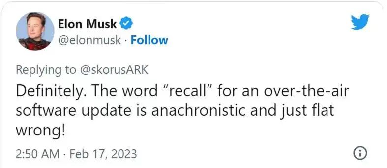召回公告发布后,特斯拉股价应声下跌约5.7%,2月16日当天收盘报202.04美元,市值一夜蒸发386亿美元。马斯克当时还在推特上回应称,NHTSA用“召回”一词来形容特斯拉的软件更新“错得离谱”。
