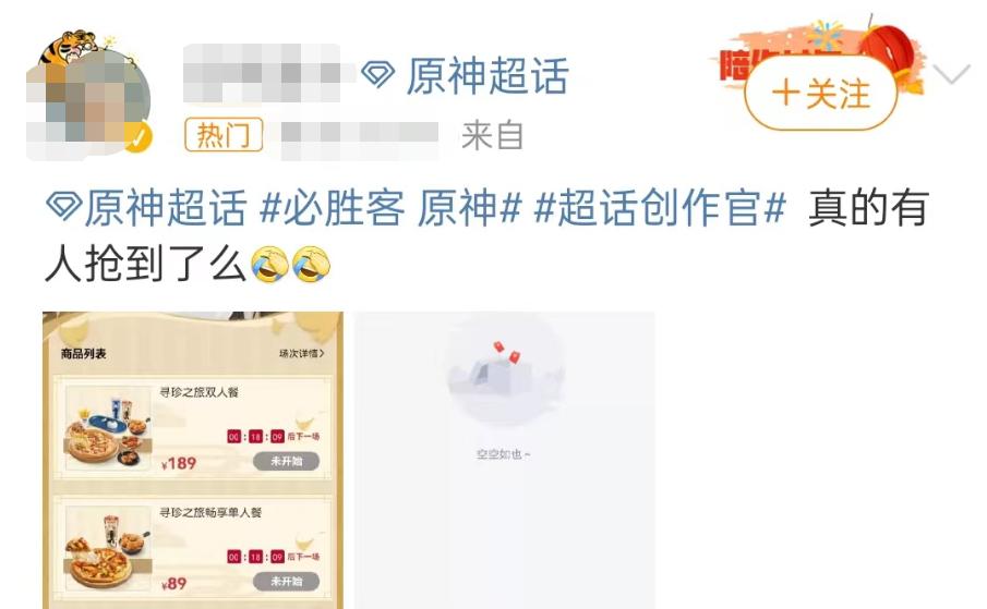 2月27日,必胜客×原神联动周边套餐正式开始预售,玩家可以通过在「必胜客Pizza Hut」App上预订联动主题套餐并获得实体周边商品。由于活动太受欢迎甚至挤爆了服务器。当天 #必胜客 原神# #必胜客崩了# 等多个关键词冲上微博热搜。