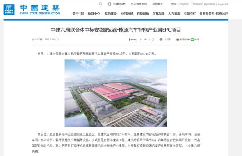 2月16日,中建六局联合体中标安徽肥西新能源汽车智能产业园EPC项目,中标额约15.44亿元。公告内容显示,该项目是合肥市重点工程,建成后将用于华为与江汽集团在合肥共同开发新一代高端智能电动汽车。