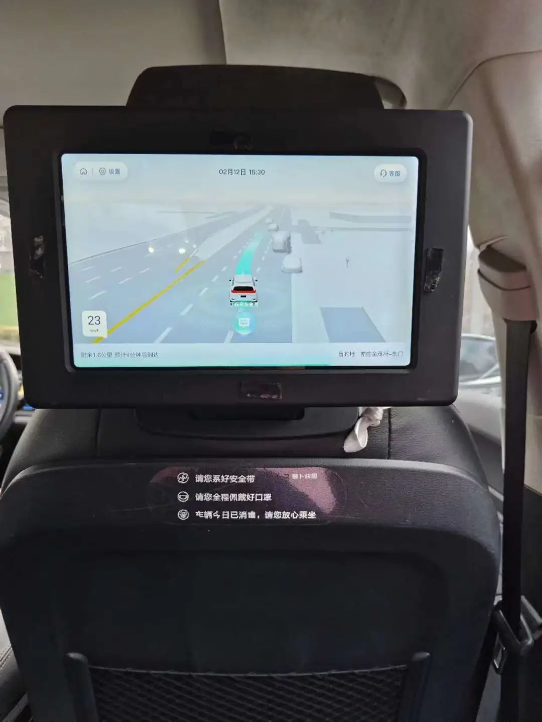 Robotaxi车内的车机、中控台等与普通汽车差别不大,前排座椅后背有两块屏幕,两个平台的车辆都是系上安全带后,在屏幕上点击确认后,才可以启动。开车路途上车辆会对变道、通过路口等操作进行语音提示,并且会把周围路况、车况实时反映在屏幕上。