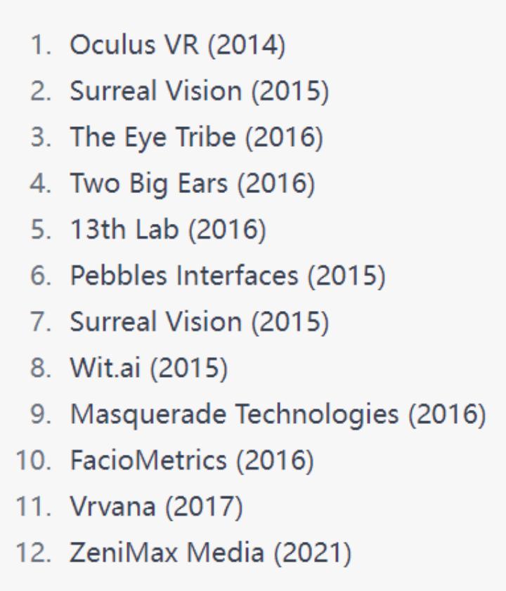 众所周知,为全面发展元宇宙和 VR 业务,Meta 在近几年已经收购了多家 VR厂商,根据我们的不完全统计,起码有以下13家。