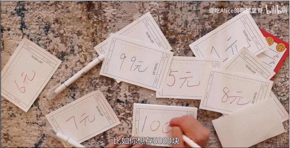 她还试着把存钱变成生活中的娱乐,发明了一个叫“便签抽取”的小游戏。比如这个月你想存够5000元,那么就找一叠便签,每张写上不同的数字,数字额度的总和加起来是5000。