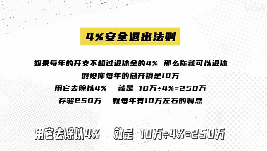 那么到底存够多少钱才算安全呢?@有数研究所就在视频里科普了一个叫“4%安全退出法则”的概念。