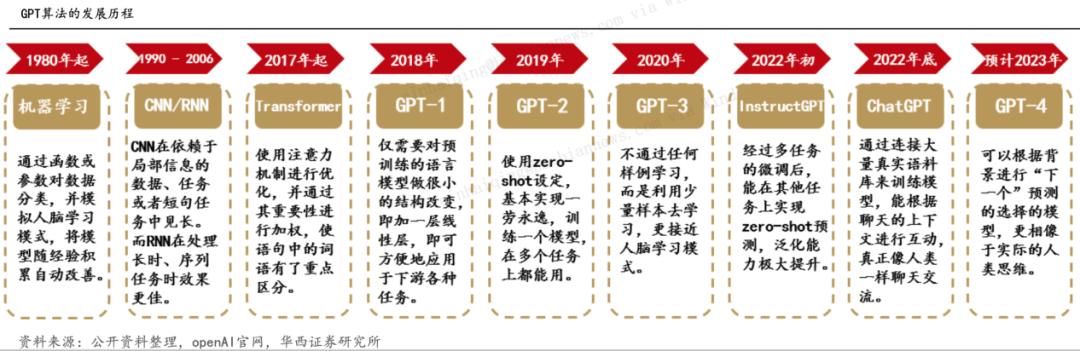 虽然GPT算法历经40年的发展,但2017年诞生的Transfomer模型最为关键,直接加速了ChatGPT的诞生。当然,没有前人的“肩膀”,Transfomer模型也难以站得更高。