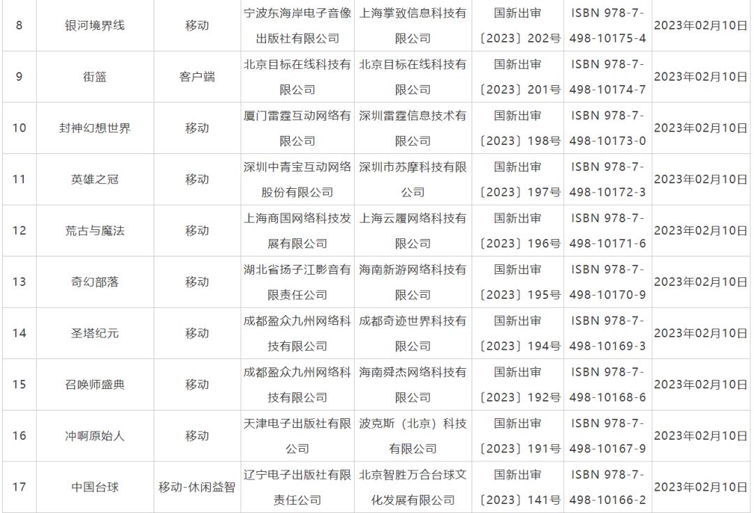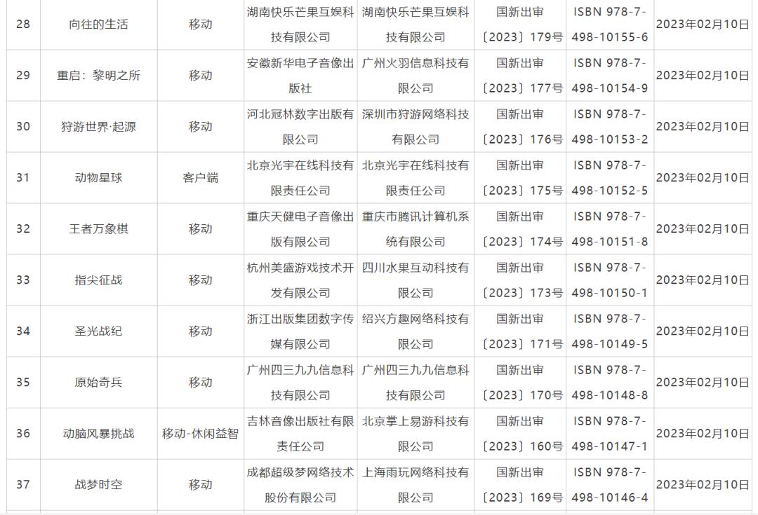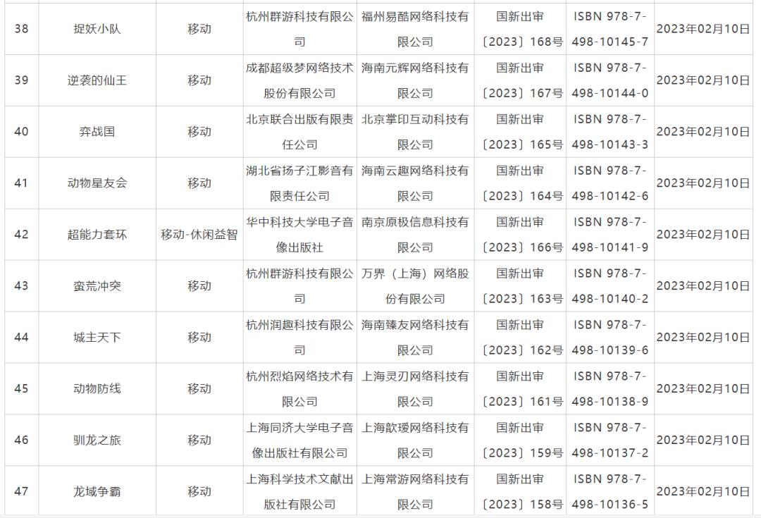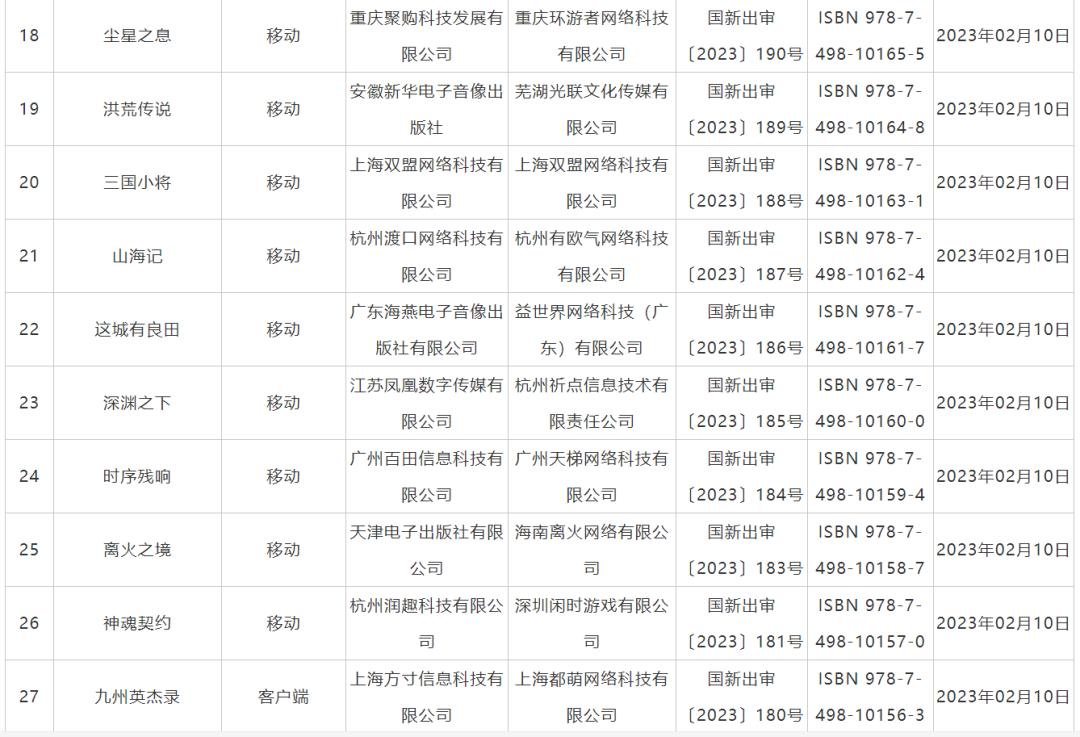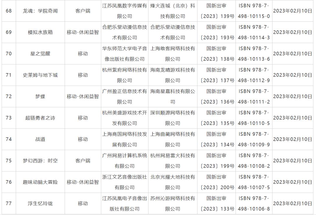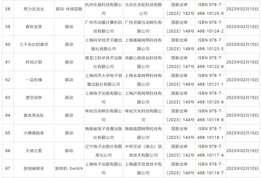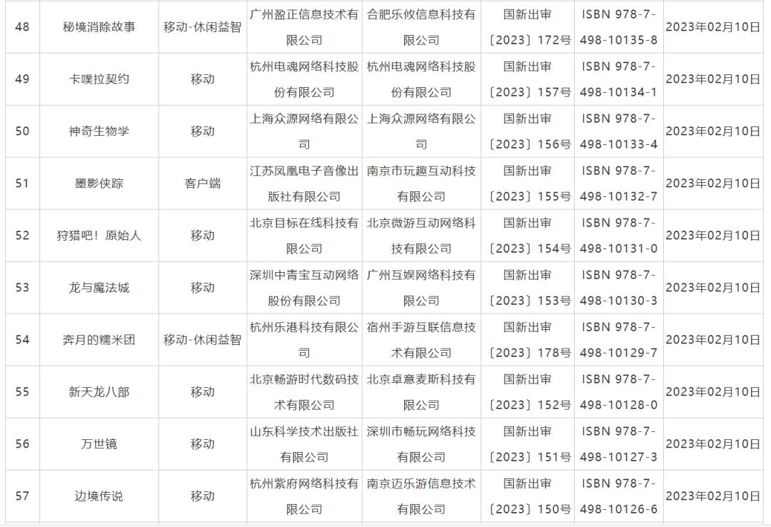 2月10日新一批的87个版号下发,时间上距上次仅24天,数量上和1月的88个基本持平,这有可能预示着版号审批的节奏会进入一长段稳定期。类别上,“移动”有68款,“移动-休闲益智”被单分了出来,有11款,“客户端”7款,“游戏机-Switch”1一款。