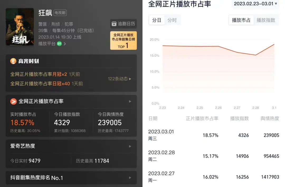 在将目光投向2月上新的剧目之前,不得不继续关注1月的“剧王”《狂飙》。虽然已经完结许久,但《狂飙》的长尾效应依旧明显。灯塔专业版显示,已经上线46天的《狂飙》全网正片播放市占率仍然位列第一,占比达到15.8%。(截至2月28日)