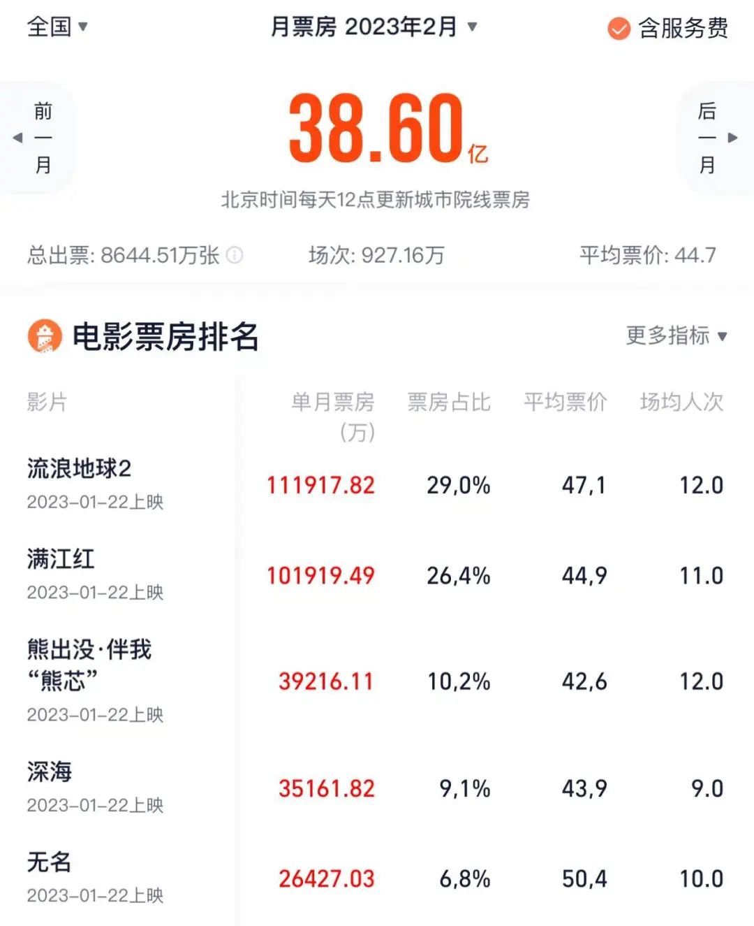 2月的电影票房为38.6亿,和历年同期相去甚远,概因往年大部分时间二月里有春节档。