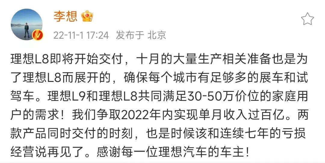 李想关于理想要结束亏损的博文,截图自李想个人微博