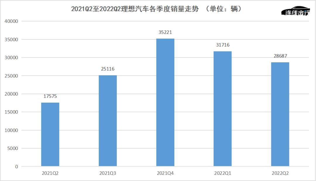 2021Q2至2022Q2理想汽车各季度销量走势,数据来源于公开数据,连线出行制图