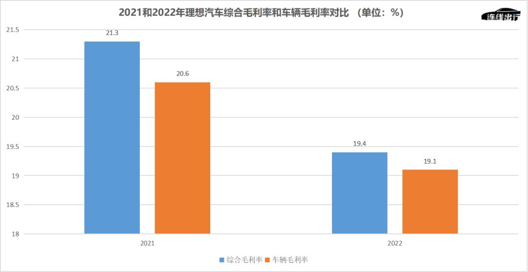 2021和2022年理想综合毛利率和车辆毛利率对比,数据来源于财报,连线出行制图