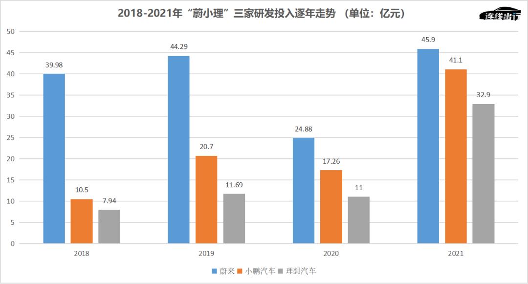 数据显示,2018-2021年,理想在研发方面的投入分别为7.94亿元、11.69亿元、11亿元和32.9亿元。