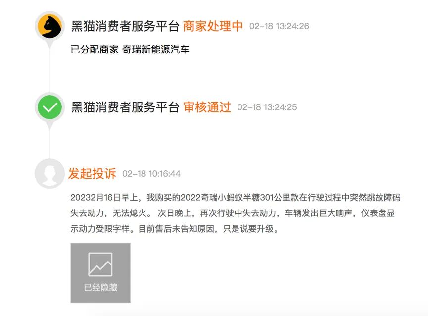 记者浏览黑猫投诉网站时发现,有小蚂蚁车主投诉称,在今年2月16日早上,其购买的2022款奇瑞小蚂蚁半糖301公里版车型在行驶过程中突然失去动力,并跳出故障码,无法熄火。“我们总结,(下)雨天更容易出现这种情况,不知道背后是什么原因。现在雨天(我)就不敢开车出门。”赵女士告诉记者。