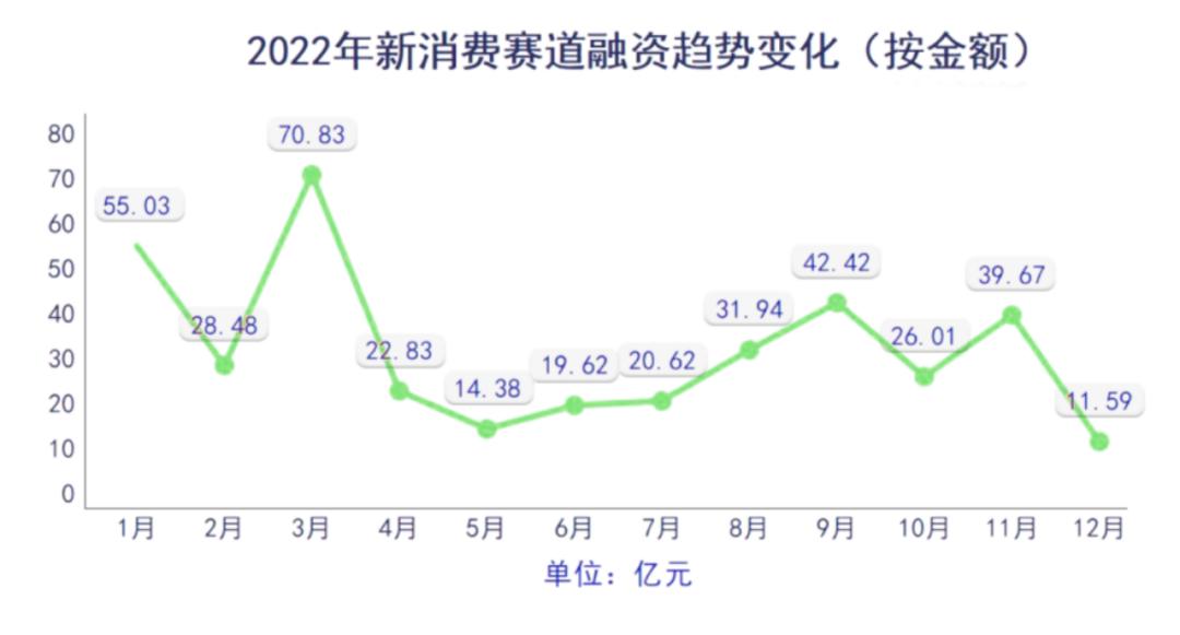 据克劳锐整理的2022年新消费赛道融资情况,除了1月和3月的融资金额超过50亿元,其余10个月的融资金额几乎都在20亿元左右徘徊,12月的融资金额直接探底到11.59亿元。