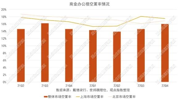 首先,近两年来由于疫情原因,商业办公楼仍在源源不断地供给,而需求端疲软无法跟上供给速度,供需不平衡导致大量商办项目积压,商办空置率高企。