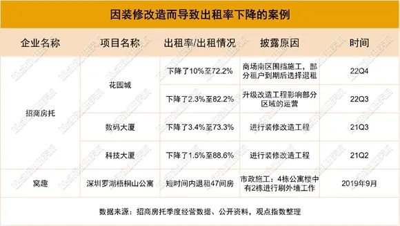 例如招商房托就曾披露多个写字楼项目及商业零售项目因为进行装修改造而导致出租率下降,花园城的出租率更是在一个季度内下降了10%。