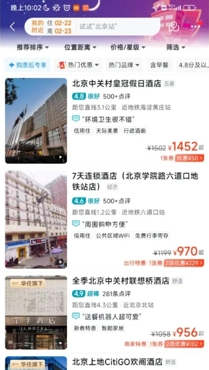 他原计划2月下旬从深圳飞北京,查询OTA酒店价格后惊掉了下巴,当下中关村一带经济型酒店价格普遍在800元-1500元:7天连锁酒店六道口地铁站店970元、全季中关村联想酒店956元、桔子水晶酒店1125元,远超公司报销标准的酒店价格让蒋思豪最终取消了这次“非必要”出差计划。