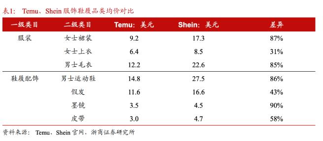 但如今,与SHEIN目标市场、优势品类高度重合的TEMU能做到更低的价格。根据浙商证券数据,TEMU在鞋履、服装等各个品类价格上能做到SHEIN价格的53%-80%。