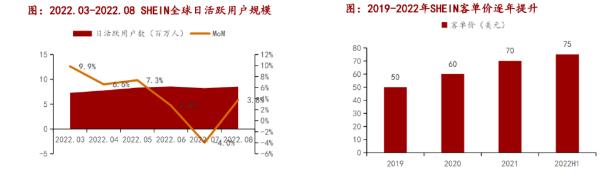 业绩表现下滑的背后,SHEIN的用户数量和用户价值增长均面临挑战。根据招商证券数据,2022年3-8月,SHEIN日活数量多个月份仅维持环比个位数增长。2022年7月份,SHEIN甚至出现DAU环比下降4%的情况。客单价方面,2022年上半年客单价同比增长7.4%。而2020年、2021年客单价分别同比增长20%、16%。