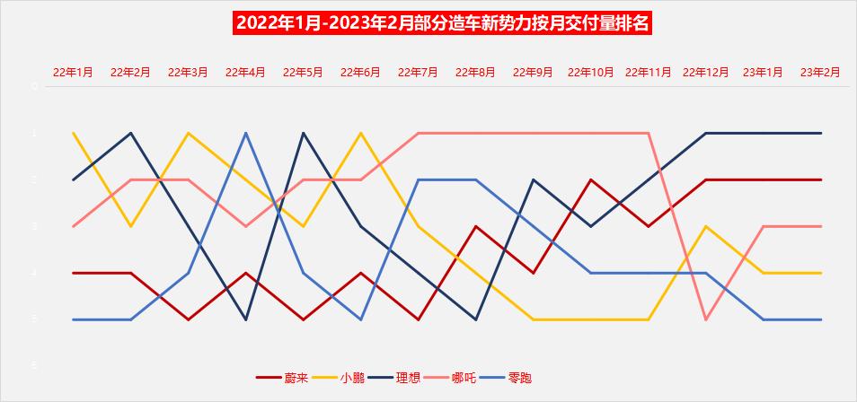 3月1日,五家造车新势力相继公布2月交付情况。其中,理想汽车连续三个月位居交付榜首位,蔚来汽车和哪吒汽车紧随其后,而小鹏汽车和零跑汽车销量出现同比下滑,大有掉队趋势。
