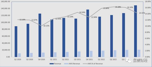 与此同时,亚马逊来自亚马逊网络服务业务的收入在过去几年里也在大幅增长。从下图可以看出,亚马逊在2022年第四季度从AWS获得了213.8亿美元的收入。