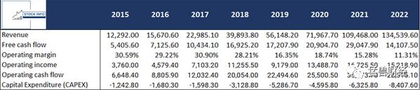 目前,亚马逊的5年营收复合年均增长率为17.15%,这表明亚马逊是有能力继续实现营收增长的。多年来,亚马逊的的经营性现金流也一直在增加,但在2022年,亚马逊陷入了困境,正如我们在上表中看到的那样。