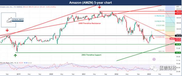 如前所述,亚马逊的股价出现了明显的下跌。在2023年一度较2021年11月的高点下跌了近57%。目前,其股价低于日线图和周线图上的所有指数移动平均值,这表明该股目前处于强劲的下行趋势中,如果这种下行趋势继续下去,80- 81美元的支撑位应该会提供重大支撑。此外,亚马逊有上升的绿色趋势线支撑,这是亚马逊股价自2001年触底以来的上升趋势线支撑。如果这两个支撑位都没有保持住,还有另一个65美元左右的支撑位,如果亚马逊的股价突破这一水平,那么它可能会进入一个完全自由落体的状态。在上行路上,亚马逊也有101美元的阻力位。这一阻力位应该出现在2018年的顶部,之后股价就下跌了36%,跌至图表所示的65.35美元支撑位。如果亚马逊股价能够突破下降的红色趋势线阻力,这将是一个看涨信号。