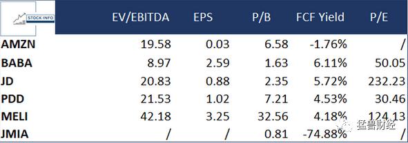 在我们深入了解了这两家公司及其基本面后,现在我们再来看看它们与竞争对手的对比。我们将对比的主要竞争对手有:京东(JD)、拼多多(PDD)、MercadoLibre (MELI)和Jumia (JMIA),后者被称为非洲电商巨头。从下表中可以看出,阿里巴巴在每个指标上都名列前茅。只是在市盈率上与拼多多相比最差。