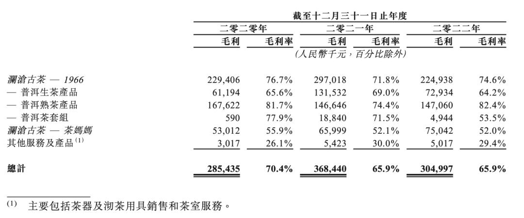 具体到产品,2020年至2022年澜沧古茶毛利率分别为70.4%、65.9%及65.9%,其中1966的毛利率较高,个别年份达到76%。