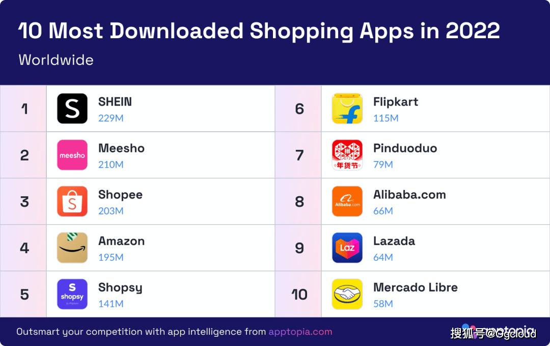 Apptopia数据显示,希音是 2022年全球下载量最大 的购物App,安装量为2.29亿次。