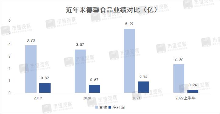 2019年到2021年德馨食品营收从3.93亿增长到5.29亿,增幅达34.61%。净利润仅从0.8亿增长至0.95亿,增幅为18.75%,远低于营收增速。