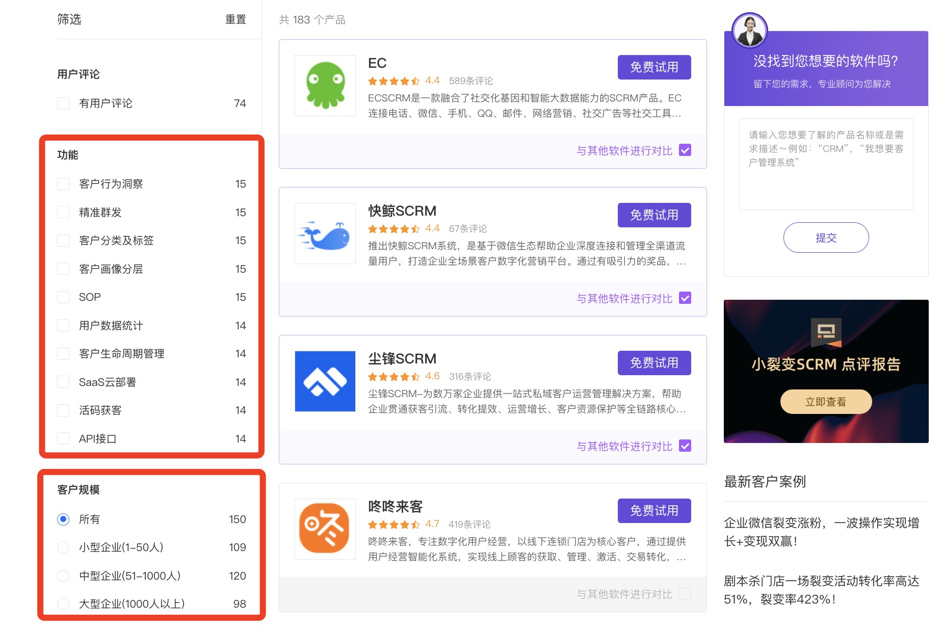 支持通过功能、客户规模筛选,还有产品对比等功能
