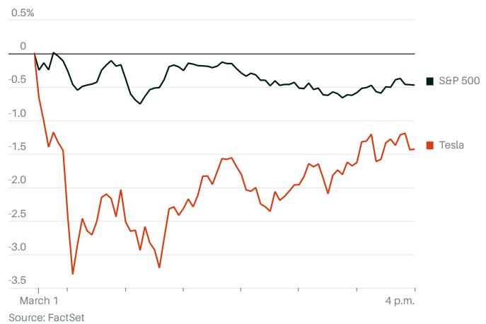特斯拉股价3月1日收盘下跌1.4%,至202.77美元,过去两周下跌约3%,不过今年迄今仍累计上涨了65%,3月2日美股盘前跌幅一度超过5%,股价也跌至191美元左右。