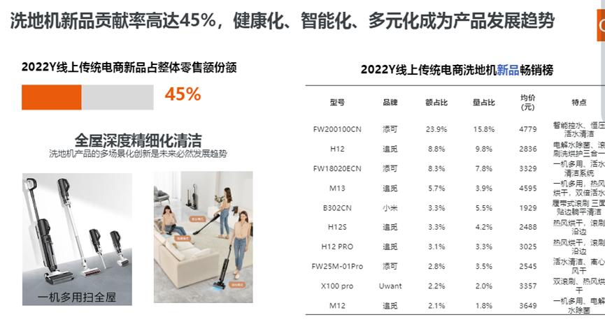 2022年,洗地机市场的爆款新品,更多围绕自清洁能力即消费者更为关心的方向迭代,但不少品牌已就洗地机的清洁能力、续航能力多维布局,以形成更为综合的品牌实力。