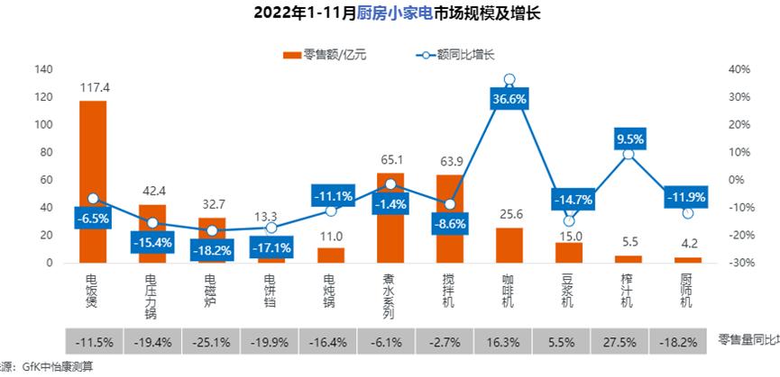据GFK中怡康数据,过去一年,豆浆机(5.5%)、咖啡机(16.3%)、榨汁机(27.5%)是仍然保持零售量同比增长的厨小家电细分赛道,而零售额仍保持同比增长的仅有咖啡机(36.6%)、榨汁机(9.5%)。