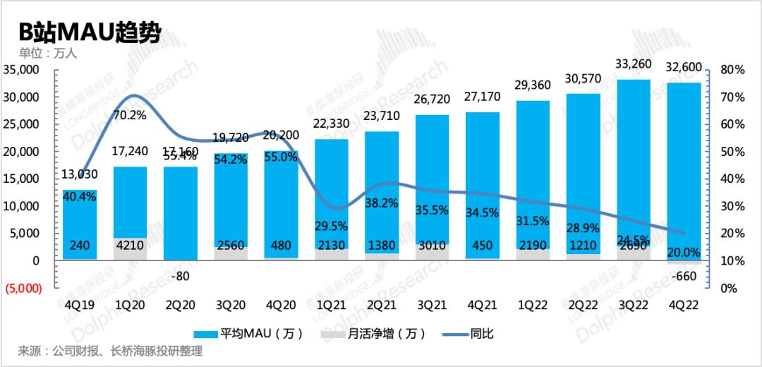 四季度B站的用户环比流失660万,整体月活(App、PC、电视等)3.26亿人,同比增长20%,可以说是首次不及预期。
