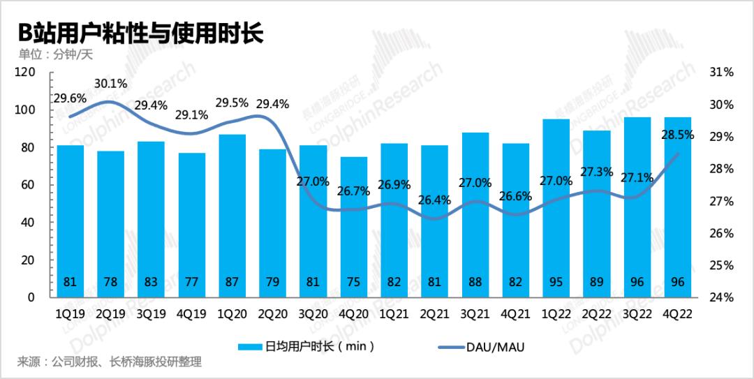 体现用户粘性的指标DAU/MAU提升至28.5%,日均用户时长为96分钟。存量用户活跃度提升,应该是与Story Mode的渗透率提升不无关系。上季度达到10万粉的Up主,有一半是靠的Story Mode内容。