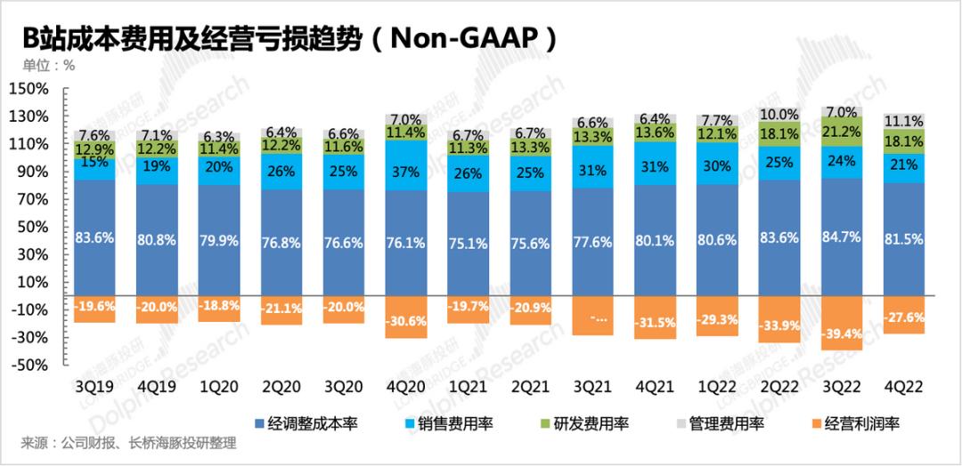最终Non-GAAP下经营亏损21亿,亏损率34%,剔除一次性后的真实亏损情况为13亿,-21%,短期比有优化,但是从B站自身的经营、现金流状况以及市场的预期来说,还得要加快。