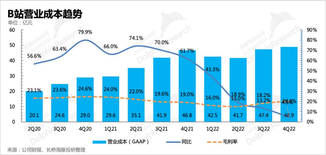 3、日活上去了,但广告变现仍吃力:一般而言,日活流量增长,广告库存拓宽,会天然吸引商家的广告预算。但B站四季度广告收入同比下滑5%,虽然有宏观环境的压力,但在低基数、Story Mode变现早期,这个水平显然太弱。