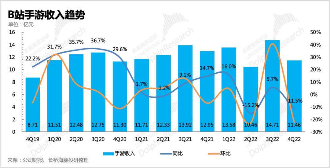 四季度B站游戏收入11.46亿元,同比下滑12%,主要源于供给太弱。