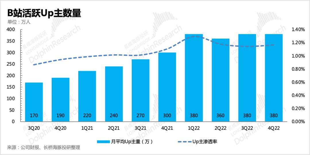 年初的激励规则调整,使得今年以来Up主的增长受到了不小的压力。四季度Up主勉强活维持在380万人。