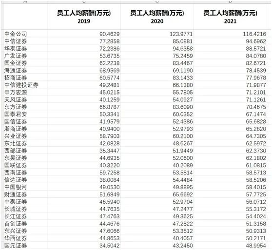 今年2月中旬,在一份披露的法院判决书中,中信证券员工自曝薪酬的事件引发关注。这位2019年首次登记执业的投行新人,自曝年薪为46.93万元,月薪为3.91万元。另据中信证券年报“三张表”数据, 2019年人均薪酬77.29万元,2020年和2021年分别为85.09万元和94.70万元。