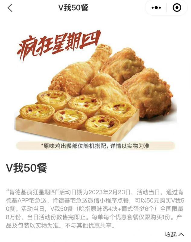 肯德基又双叒叕整活儿了,其"疯四文学"中的经典表述"V我50",竟然被官方变成了套餐。潘哥发现,这款“V我50”餐售价50元,包含4个吮指原味鸡,6个葡式蛋挞,全国限量8万份。