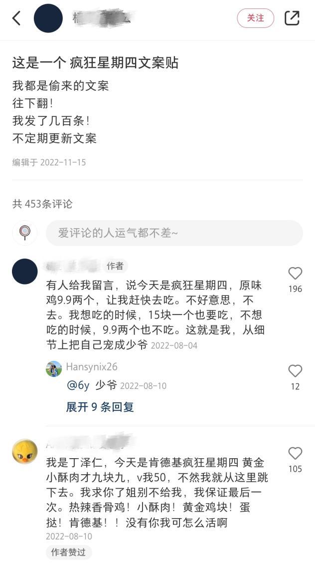 除此之外,还有更多的“疯四文学”,不断被网友创作出来。潘哥在小红书发现,一条有关肯德基“疯四文学”征集的笔记,获得了超过450条留言,留言区的网友们人均文学大师,天马行空的文字层出不穷。