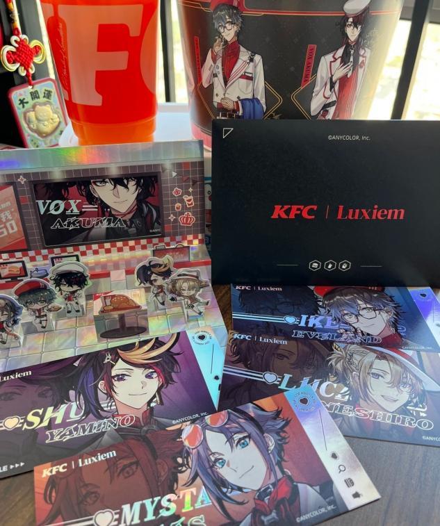 比如,最近一段时间,肯德基与Luxiem联名,只要购买Luxiem绚彩玩味桶,就可以获得定制立绘立体卡、绚彩镭射卡一份。