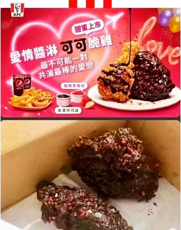 比如,不久前的情人节期间,肯德基推出的爱情酱淋可可脆鸡,就被有些网友吐槽为:“这简直是依托答辩(一坨大便)。”还有网友表示:“这是洋快餐界的九转大肠?”