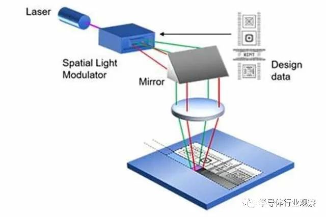 光学原理通常是使用激光通过DMD镜面列阵来控制激光输出的图形,从而使晶圆上被曝光的图形符合layout的原始设计,称为laser writer。从目前公开的信息可知,大多数laser writer的光源为波长在300~400nm之间的紫外光,分辨率可达到为500nm至数微米之间,高分辨率条件下也会牺牲相当的产能。