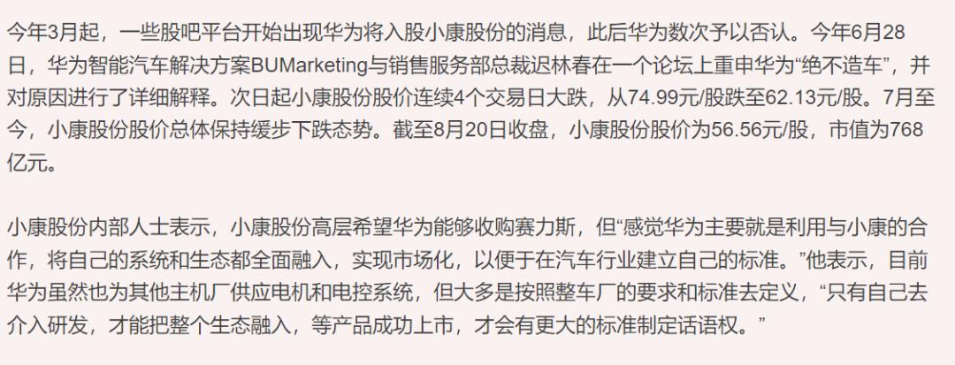 曾有传闻称,小康股份内部人士表示,小康股份高层希望华为能够收购赛力斯。但笔者认为,在华为一再重申“不造车”、并与多个主机厂推进实质性合作的情况下,华为收购赛力斯的概率很低。
