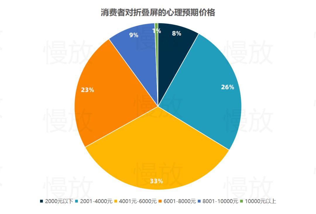 在被问及消费者心目中折叠屏的价格区间时,33%的消费者认为应该在4001-6000元,23%的消费者可接受6001-8000元区间,但也有26%的消费者认为折叠屏手机可以把价格做到2001-4000元。
